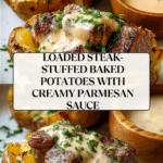 Keywords: baked potatoes, steak stuffed potatoes, Parmesan cream sauce, sirloin steak recipes, hearty dinner, comfort food
