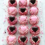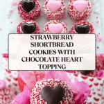 Keywords: strawberry shortbread cookies, shortbread, strawberry cookies, sprinkle cookies, chocolate heart topping, easy cookies, holiday cookies, valentine cookies