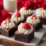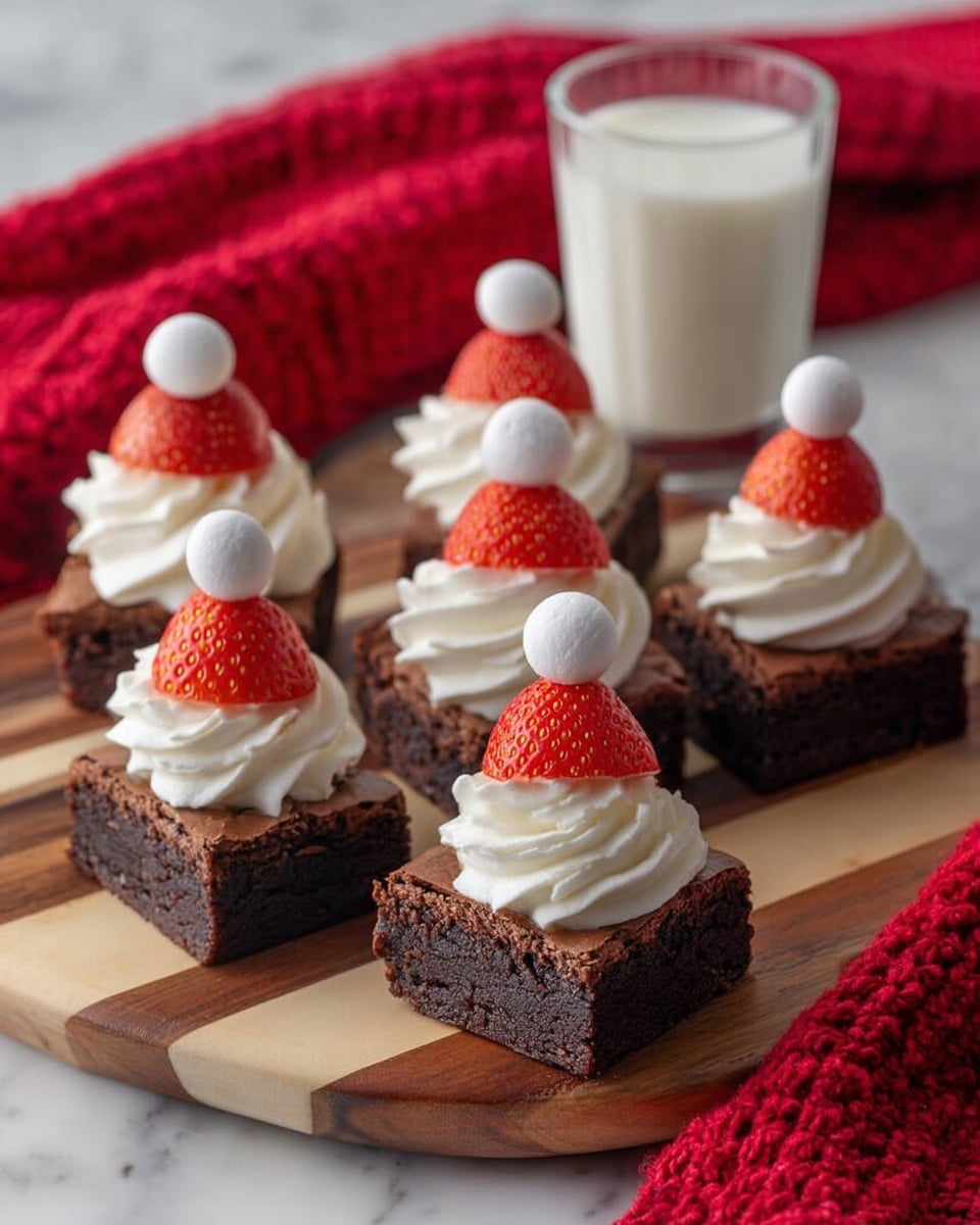 Delicious, easy-to-make brownie hats featuring rich brownies topped with a sweet white icing and fresh strawberries, perfect for a quick dessert or party treat.