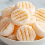 The image shows a close-up view of several small, round sweets stacked in a white bowl. Each sweet is pale white with a slightly rough texture and has thin, parallel orange-yellow lines running across the top. The sweets look soft yet firm, with granulated sugar crystals visible on the surface, adding a delicate sparkle. The background is a white marbled texture, giving a clean and bright look to the setting. photo taken with an iphone --ar 4:5 --v 7