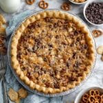 Texas Trash Pie is a decadent, no-fuss dessert featuring a rich mixture of chocolate, caramel, pretzels, coconut, pecans, and graham crackers baked in a flaky deep dish pie crust. This sweet and salty treat boasts a golden top with a gooey, chewy center that’s perfect for holidays or anytime indulgence.