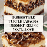 Turtle Lasagna is a decadent no-bake dessert featuring layers of creamy cheesecake, rich chocolate pudding, and a crunchy cookie crust. Topped with caramel, chocolate sauce, and pecans, it’s an irresistible treat perfect for any occasion.