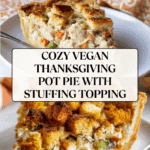 This comforting Vegan Thanksgiving Pot Pie features a flaky vegan pie crust filled with a creamy vegetable and chick’n mixture, topped with a flavorful vegan stuffing. It combines tender carrots, celery, onions, and peas in a rich, thyme-scented gravy made with vegan butter, broth, and vegan heavy cream. Perfect for a holiday meal or any cozy dinner, this pie is baked to golden perfection with a savory stuffing crust that adds a delightful texture contrast.